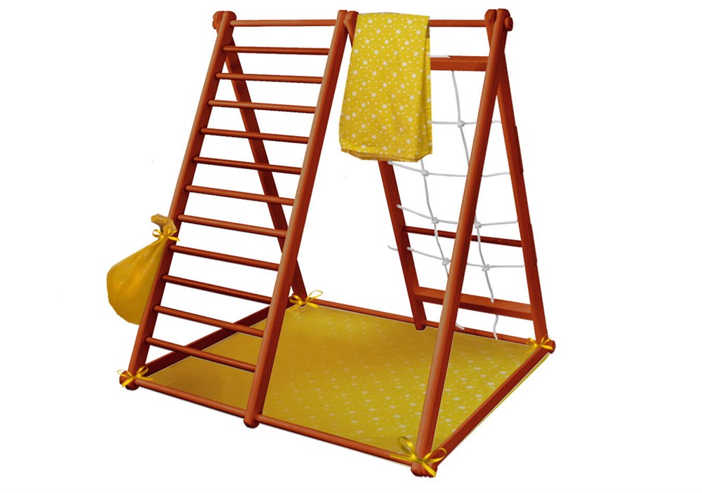 Комплектация: в комплект входят лестница с сеткой для лазания, палатка-накидка, мат и сумка для игрушек. Это позволяет ребенку не только заниматься спортом, но и играть в различные игры.
