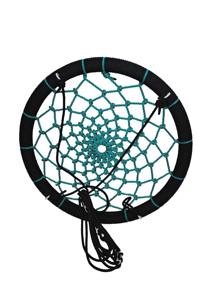 Сетка- паутина сплетена из каната диаметром 10 мм.Подвес качелей выполнен из каната диаметром 15 мм. Длина подвеса 2 метра.Качели рассчитаны на нагрузку до 100 кг