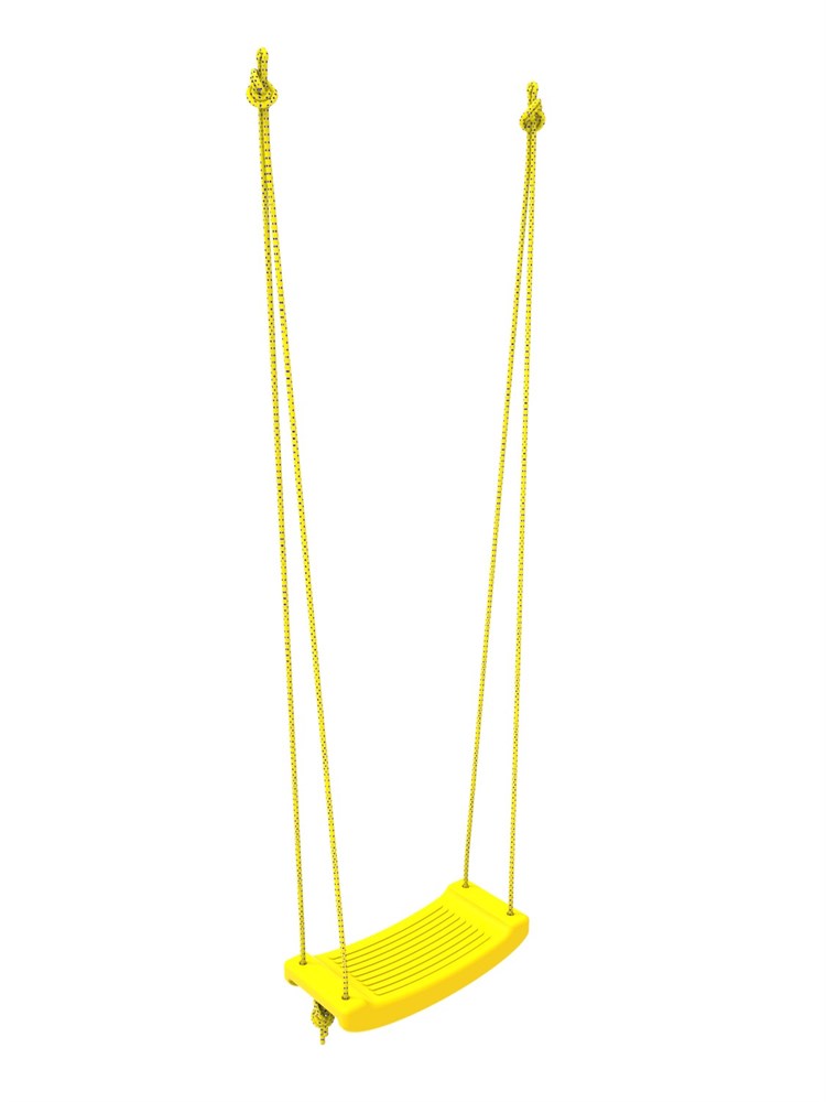 Пластиковые качели желтого цвета с изогнутым сиденьем на веревочном подвесе длиной 1700 мм. Размер качелей 170,430,100 мм.