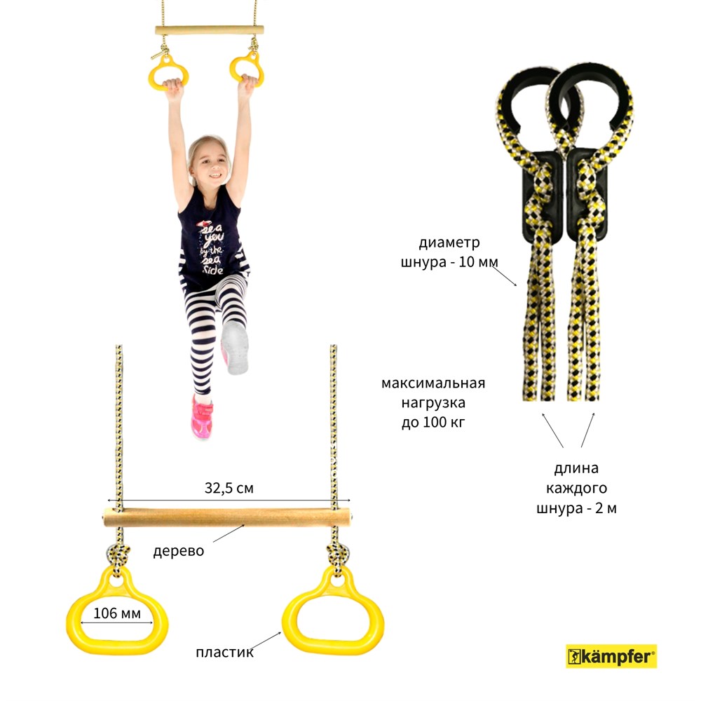 Кольца гимнастические с перекладиной Kemfer расширяют возможности комплекса так как совмещают в с ебе два самых популярных спортивных сняряда - гимнастические кольца и трапекцию. На кольцах 2 в 1 Kemfer можно висеть, хватаясь руками или ногами. Кроме того, кольца можно использовать как дополнительную опору во время лазания по спортивному комплексу. Пластиковые гимнастические кольца 2 в 1 — спортивный аксессуар для спорткомплексов любой модификации. Оригинальный дизайн колец отличает продукцию Kemfer от колец других производителей.