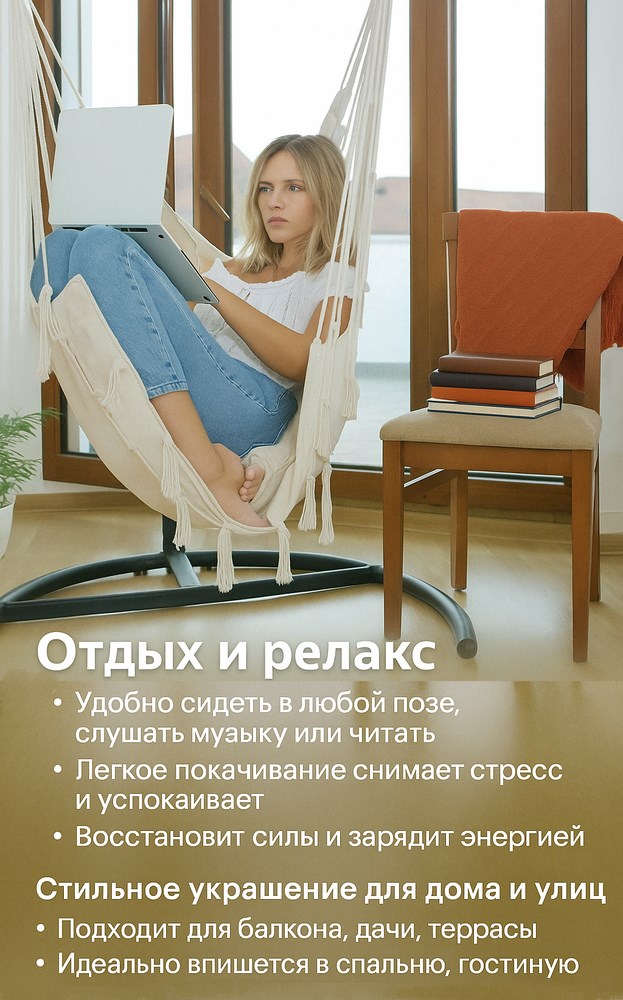 Кресло-гамак украшен кисточками в стиле макраме придающие уютный и элегантный вид