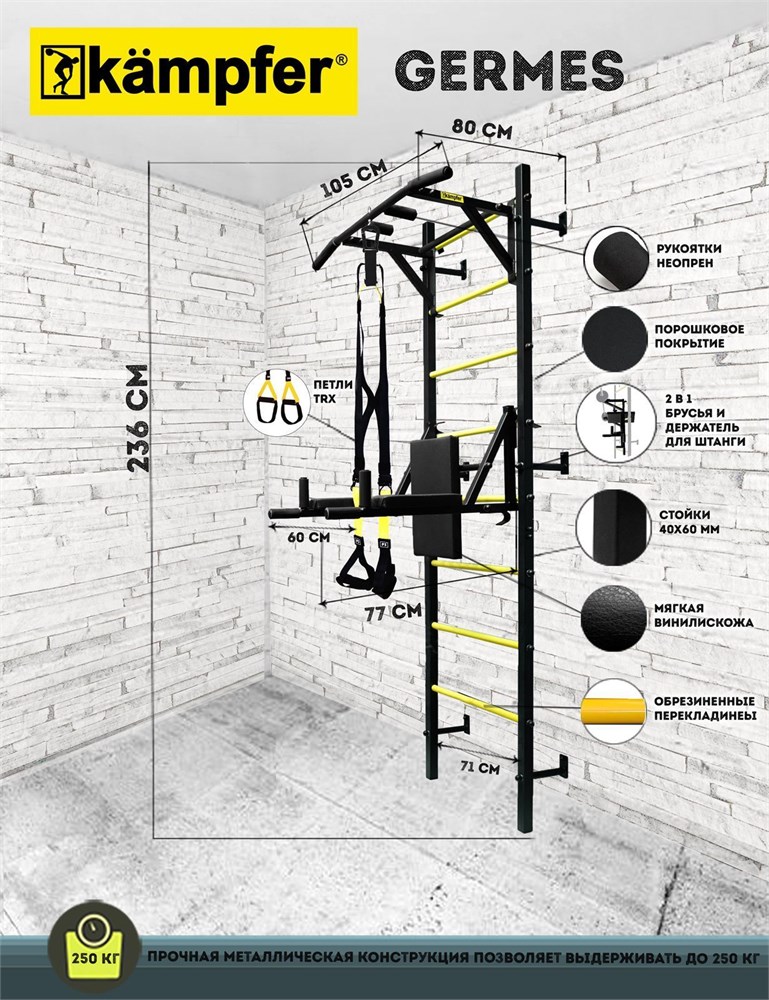 Kemfer Germes Powerful является многофункциональным спортивным снарядом для домашних тренировок всей семьи так как совмещает в себе функционал сразу нескольких тренажеров: турник с различными хватами, универсальные спортивные брусья для отжиманий при перевороте превращаются в держатель штанги, а так же петли TRAINER PRO которые крепятся к спортивному комплексу и позволяют выполнить множество упражнений, на развитие мышц пресса и рук. Турник передвижной, устанавливается под размер пользователя. Шведская стенка изготовлена из толстостенного металлопроката с использованием надежных сварных соединений в среде защитного газа и качественных болтовых соединений. Конструкция окрашена порошковой краской с повышенной стойкостью к сколам и царапинам. В отличии от аналогичных моделей Professional, которые имеют цельнолитые вертикальные стойки шведской стенки, модель Powerful - имеет более компактную, сборную конструкцию стоек шведской стенки, что значительно облегчает ее перевозку и сборку-установку. Прочная металлическая конструкция позволяет выдерживать до 250 кг, что позволяет проводить силовые нагрузки с гантелями и штангой.