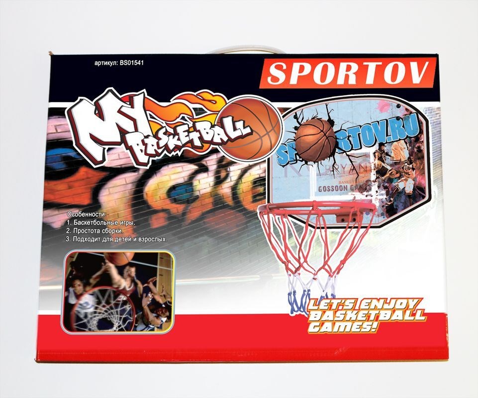 Комплектация включает в себя баскетбольный щит, кольцо, сетку, насос и мяч.