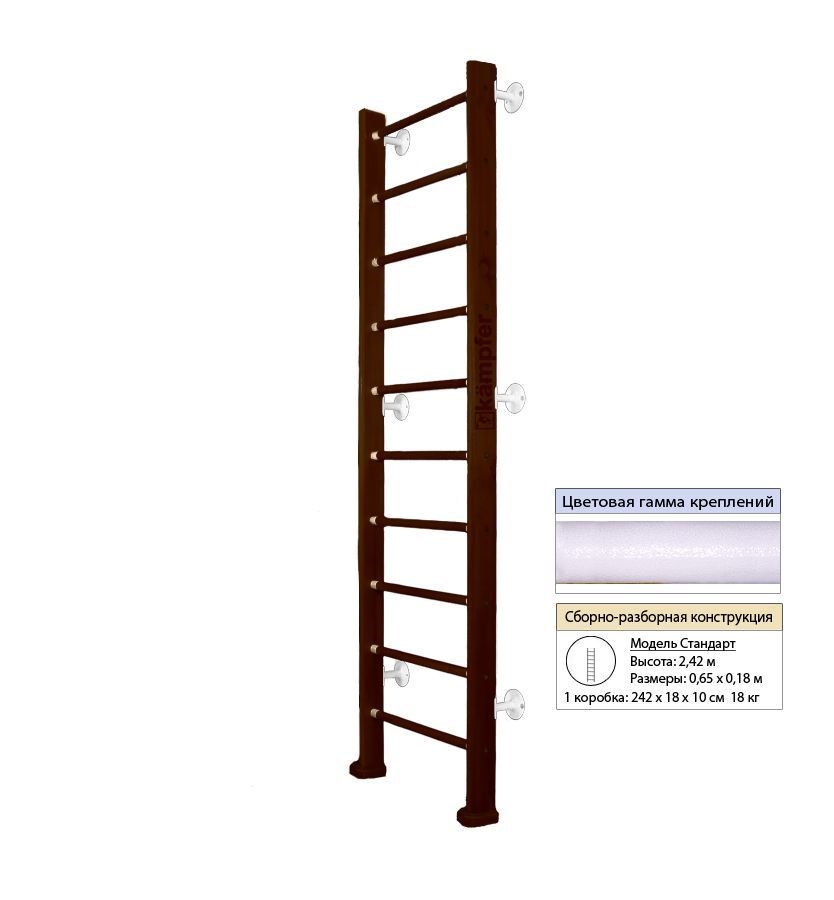 Крепление комплекса к стене универсальный и надежный вариант крепления. Можно использовать для помещений с подвесными и натяжными потолками. Не подходит при хрупких и гипсокартонных стенах , для них лучше подойдут модели с креплением враспор. Особенностью моделей Kampfer является шесть креплений к стене, в отличие от обычных пристенных моделей, у которых только четыре крепления. Увеличение количества креплений до шести обеспечивает самые надежные и максимально безопасные занятия на дск Kampfer. Комплектация: — шведская стенка Характеристики: — Высота (общая): 2,42 м — Ширина шведской стенки: 64 см — Общая длина выступа от стены: 18 см — Размер крепления к стене: 8 см — Размер стойки лестницы : 10 см — Заглушка 0,7 мм — Крепление: к стене — Размеры(ДхШхВ): 0,18 х. 0,69 х 2,42 м — Допустимая нагрузка: 120 кг — Гарантийный срок: 2 года — Тип упаковки: картонная коробка — Размер упаковки (ДхШхВ): 2,42 х 0,18 х 0,10 м — Размер упаковки спец.заказа: 3,0 х 0,21 х 0,12 м — Вес: 17 кг Дополнительные данные по размерам: — Размер деревянной стойки(ДхШхВ): 10 х 4 х 240 см — Размер нижних кронштейнов-упоров(ДхШхВ): 15 х 9 х 2 см Также имеется возможность заказать Kampfer Classic Wall Высотой 3 м: + 10% к стоимости Дск изготовление по предварительному заказу в течении двух недель.