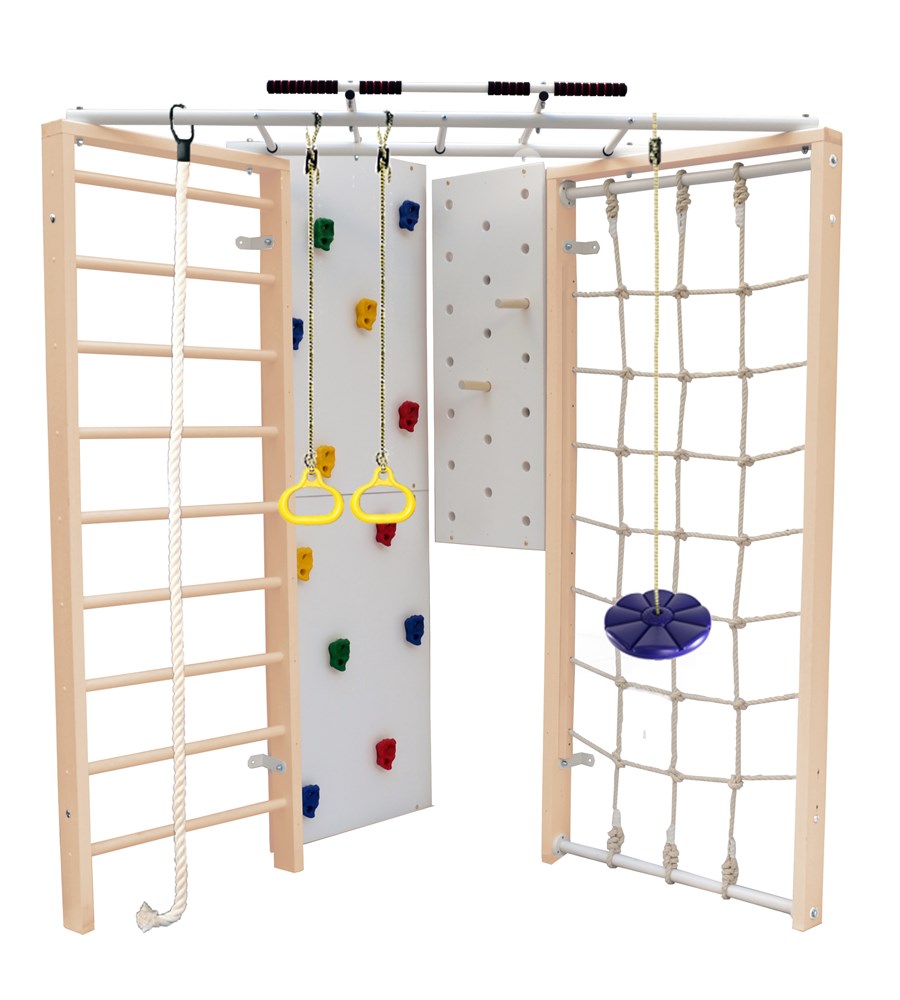 Комплектация шведской стенки включает в себя турник, шведскую стенку, канатный лаз, скалодром, пегборд, канат, кольца и лиану. Все элементы выполнены из прочного и экологически чистого дерева, что обеспечивает безопасность и долговечность использования.