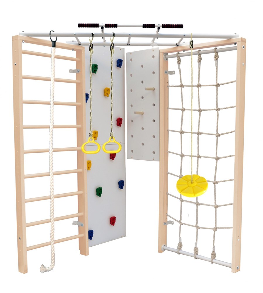 Комплектация шведской стенки включает в себя турник, шведскую стенку, канатный лаз, скалодром, пегборд, канат, кольца и лиану. Все элементы выполнены из прочного и экологически чистого дерева, что обеспечивает безопасность и комфорт во время использования.