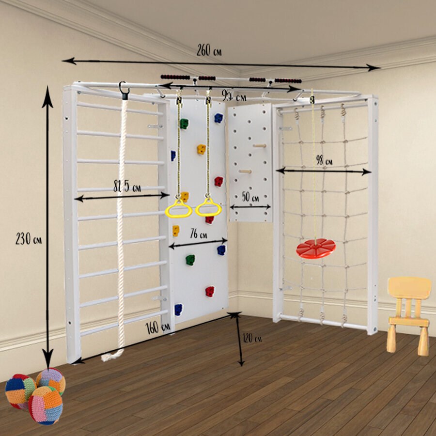 Размеры шведской стенки составляют 1,6 x 2,6 х 2,3 м, что позволяет разместить ее даже в небольших помещениях. Общая ширина конструкции с турником составляет 260 см, а ширина захвата турника - 95 см.