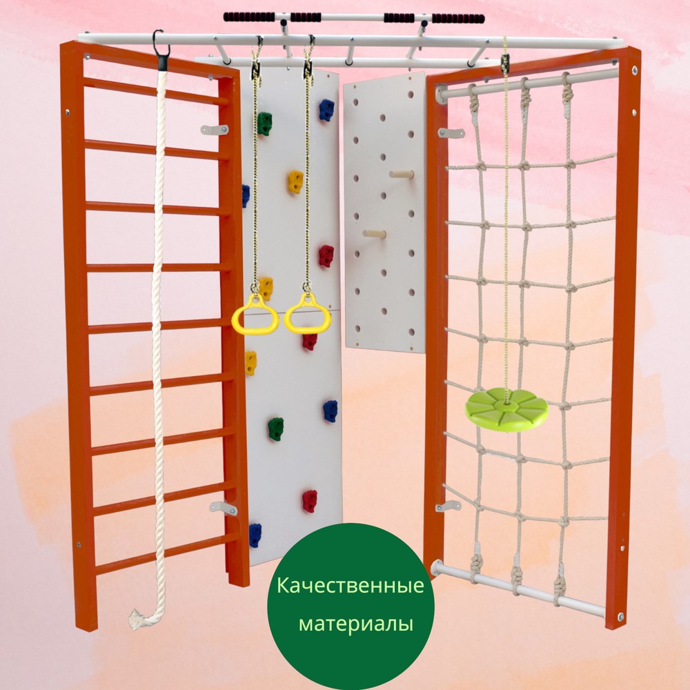 В комплектацию шведской стенки входят турник, канатный лаз, скалодром, пегборд, канат, кольца и лиана. Турник выдерживает нагрузку до 120 кг, а навесное оборудование - до 100 кг. Допустимая нагрузка на скалолаз, пегборд, канатный лаз и навесное оборудование составляет 50 кг.
