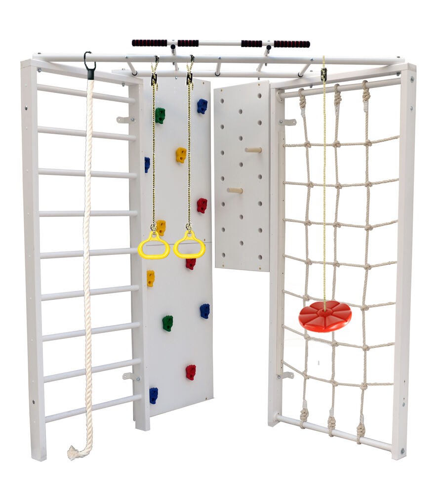 Комплектация шведской стенки включает в себя турник, шведскую стенку, канатный лаз, скалодром, пегборд, канат, кольца и лиану. Это позволяет использовать комплекс как для занятий спортом, так и для игр.