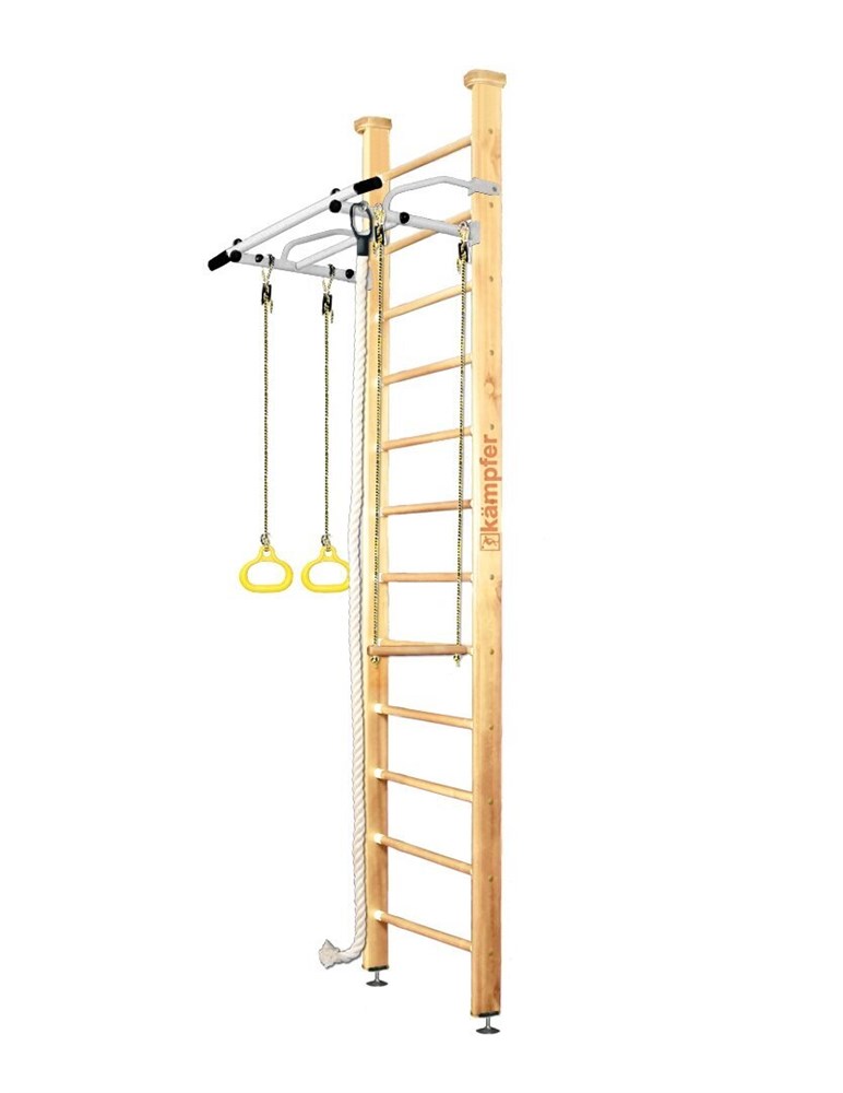 Шведская стенка Kemfer Helena Ceiling изготовлена из дерева, что обеспечивает прочность и долговечность конструкции. Максимальная нагрузка на комплекс составляет 120 кг, что позволяет использовать его для детей разного возраста и пола.
