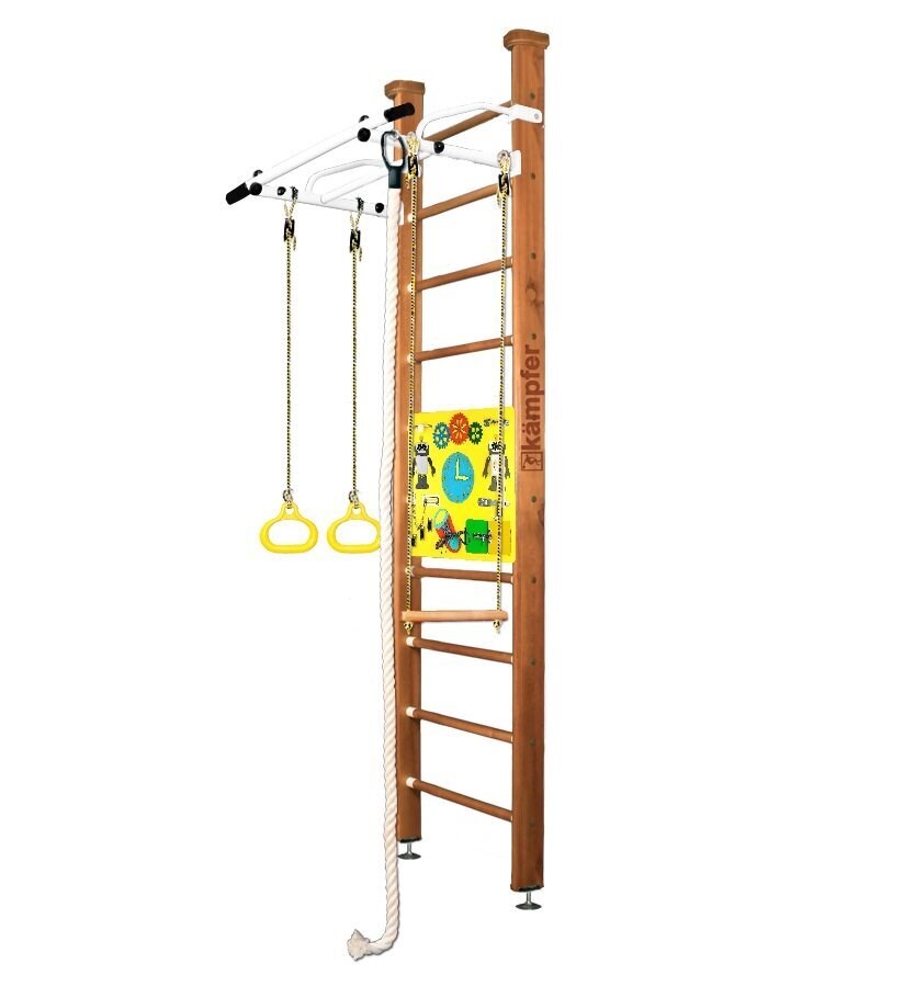 Kemfer Helena Ceiling Busyboard - это деревянный детский спортивный комплекс, который крепится враспор между полом и потолком. Он включает в себя турник, трапецию, канат, гимнастические кольца и детскую развивающую игрушку-бизиборд Умная доска Kemfer Busyboard Fixiki.