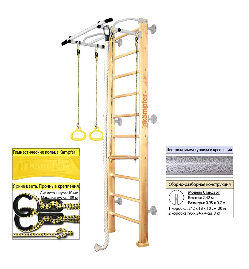 Комплектация шведской стенки включает в себя турник, канат, кольца и трапецию, что позволяет разнообразить занятия и сделать их более интересными и разнообразными.