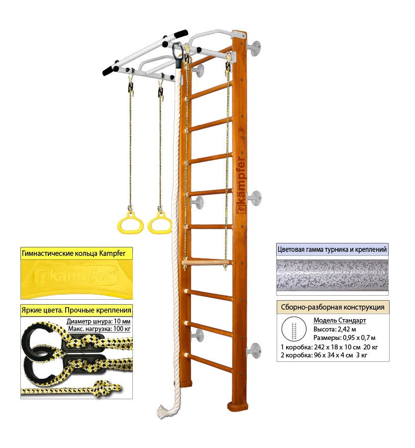 Комплектация шведской стенки включает в себя турник, канат, кольца и трапецию. Это позволяет ребенку заниматься различными видами упражнений, развивая при этом силу, гибкость и координацию движений.