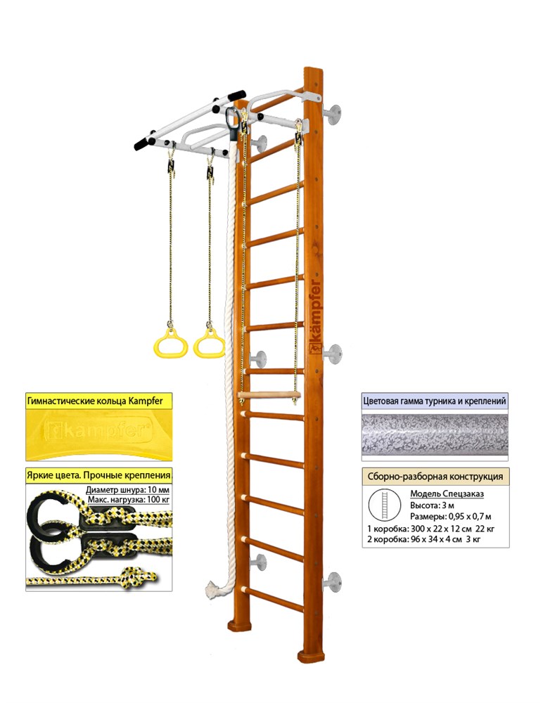 Модель Kemfer Helena включает в себя набор из самых популярных навесных аксессуаров канат, кольца и трапецию. Крепкий металлический турник выдерживает нагрузку до 120 кг, подходит как детям так и взрослым. Навесное оборудование Kemfer на прочных тросах выдерживает нагрузку до 100кг. Особенностью пристенной шведской стенки Kemfer Helena является шесть креплений к стене, в отличие от обычных пристенных моделей, у которых только четыре крепления. Увеличение количества креплений до шести обеспечивает самые надежные и максимально безопасные занятия на ДСК Kemfer.