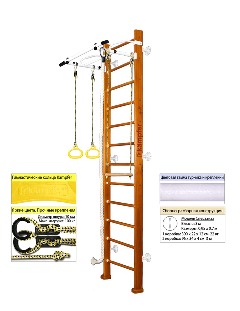 Модель Kemfer Helena включает в себя набор из самых популярных навесных аксессуаров канат, кольца и трапецию. Крепкий металлический турник выдерживает нагрузку до 120 кг, подходит как детям так и взрослым. Навесное оборудование Kemfer на прочных тросах выдерживает нагрузку до 100кг. Особенностью пристенной шведской стенки Kemfer Helena является шесть креплений к стене, в отличие от обычных пристенных моделей, у которых только четыре крепления. Увеличение количества креплений до шести обеспечивает самые надежные и максимально безопасные занятия на ДСК Kemfer.