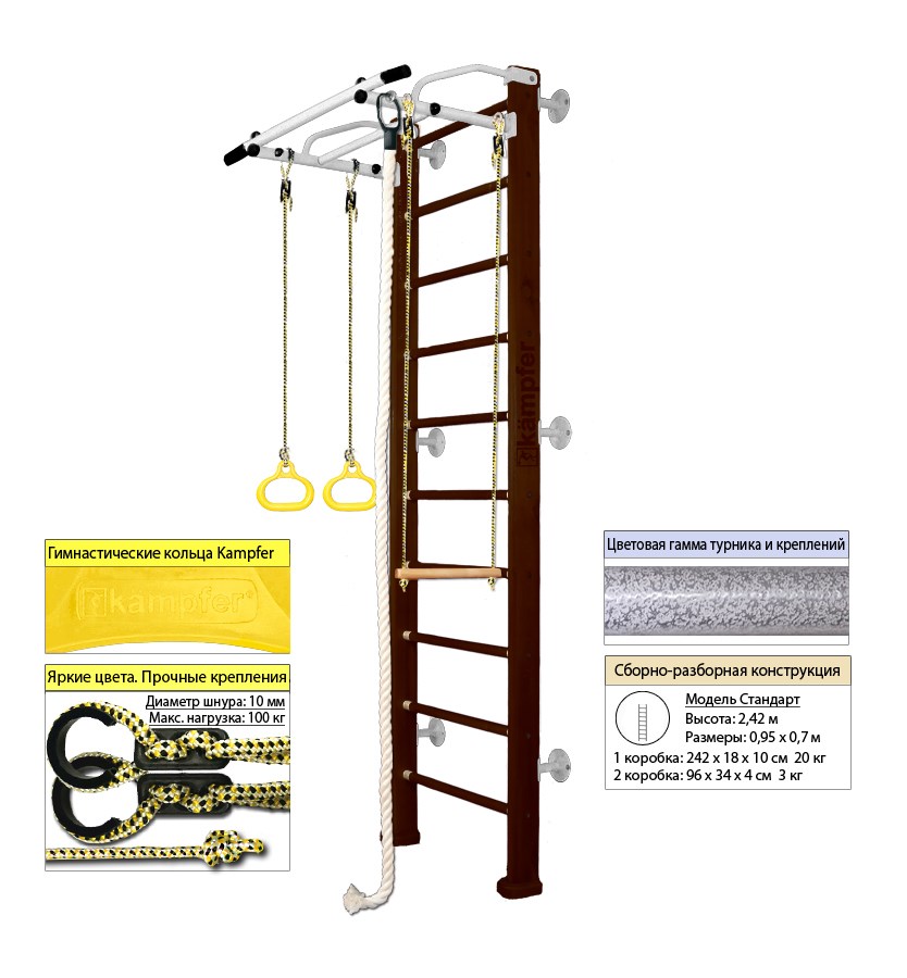 Комплектация шведской стенки включает в себя турник, канат, кольца и трапецию. Это позволяет вашему ребенку заниматься различными видами упражнений, развивая силу, гибкость и координацию.