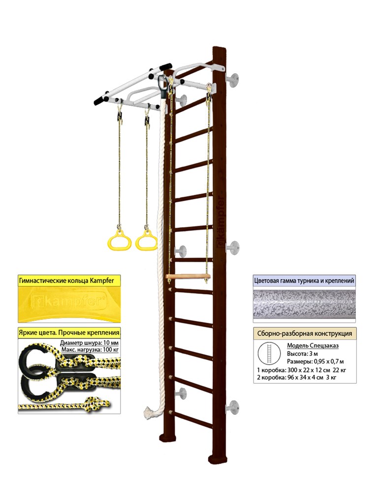 Модель Kemfer Helena включает в себя набор из самых популярных навесных аксессуаров канат, кольца и трапецию. Крепкий металлический турник выдерживает нагрузку до 120 кг, подходит как детям так и взрослым. Навесное оборудование Kemfer на прочных тросах выдерживает нагрузку до 100кг. Особенностью пристенной шведской стенки Kemfer Helena является шесть креплений к стене, в отличие от обычных пристенных моделей, у которых только четыре крепления. Увеличение количества креплений до шести обеспечивает самые надежные и максимально безопасные занятия на ДСК Kemfer.