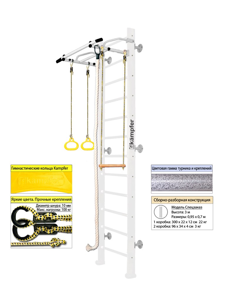Особенностью данной модели является ее комплектация, включающая турник, шведскую стенку, канат, кольца и трапецию. Турник имеет ширину захвата 95 см и длину выступа от стены 70 см, что позволяет заниматься на нем как детям, так и взрослым. Допустимая нагрузка на турник составляет 120 кг, а на навесное оборудование - 100 кг.
