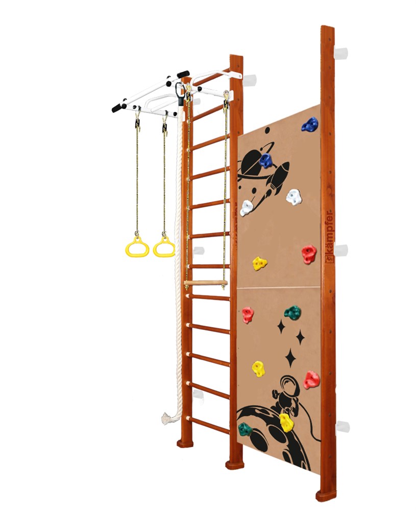 Особенностью шведской стенки является большой двойной скалолаз, имеющий 12 пластиковых зацепов. Это позволяет разнообразить занятия и сделать их более интересными и разнообразными.