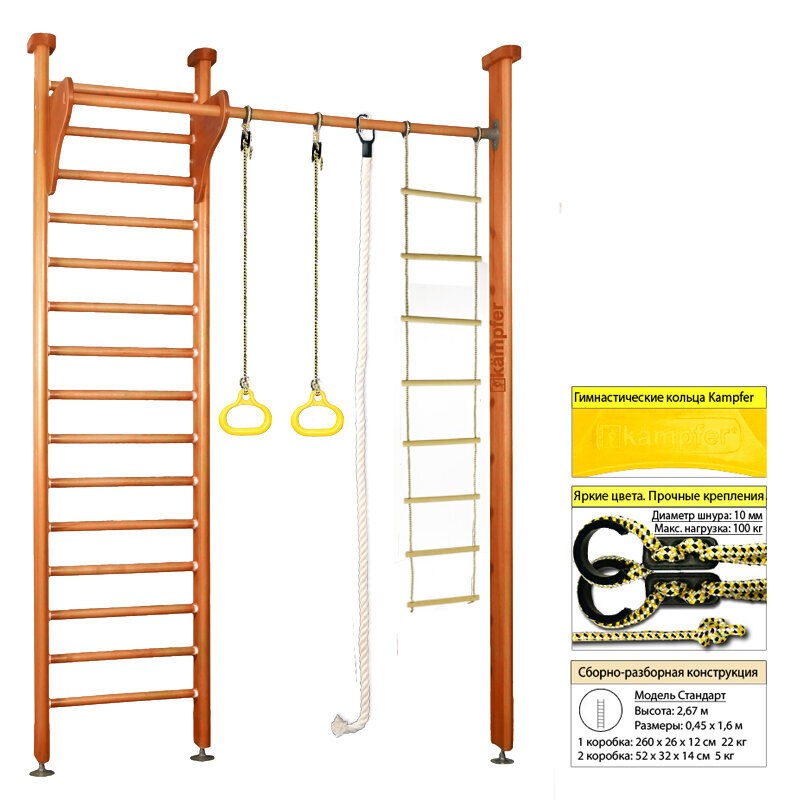 Комплектация шведской стенки Kemfer Line включает в себя все необходимое для активного и безопасного времяпровождения вашего ребенка. В комплект входят шведская стенка, канат, веревочная лестница, кольца и трапеция. Это позволяет вашему ребенку заниматься спортом, развивать координацию движений и физическую силу.