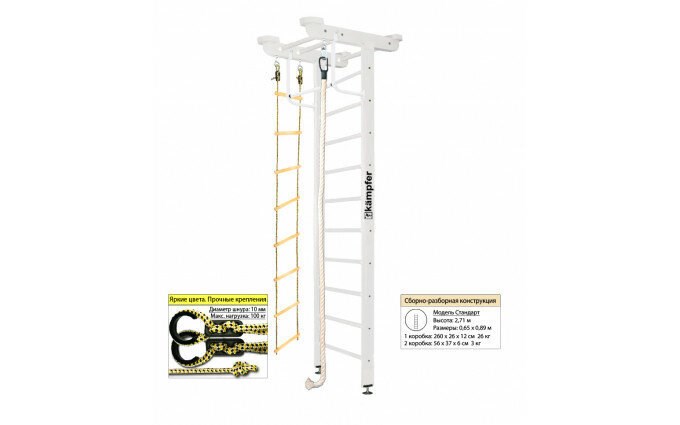 Высота шведской стенки составляет 2,71 метра, что позволяет использовать ее даже в небольших помещениях. Ширина стойки лестницы составляет 10 см, а длина стойки для навесного оборудования - 0,89 метра. Допустимая нагрузка на комплекс составляет 120 кг.