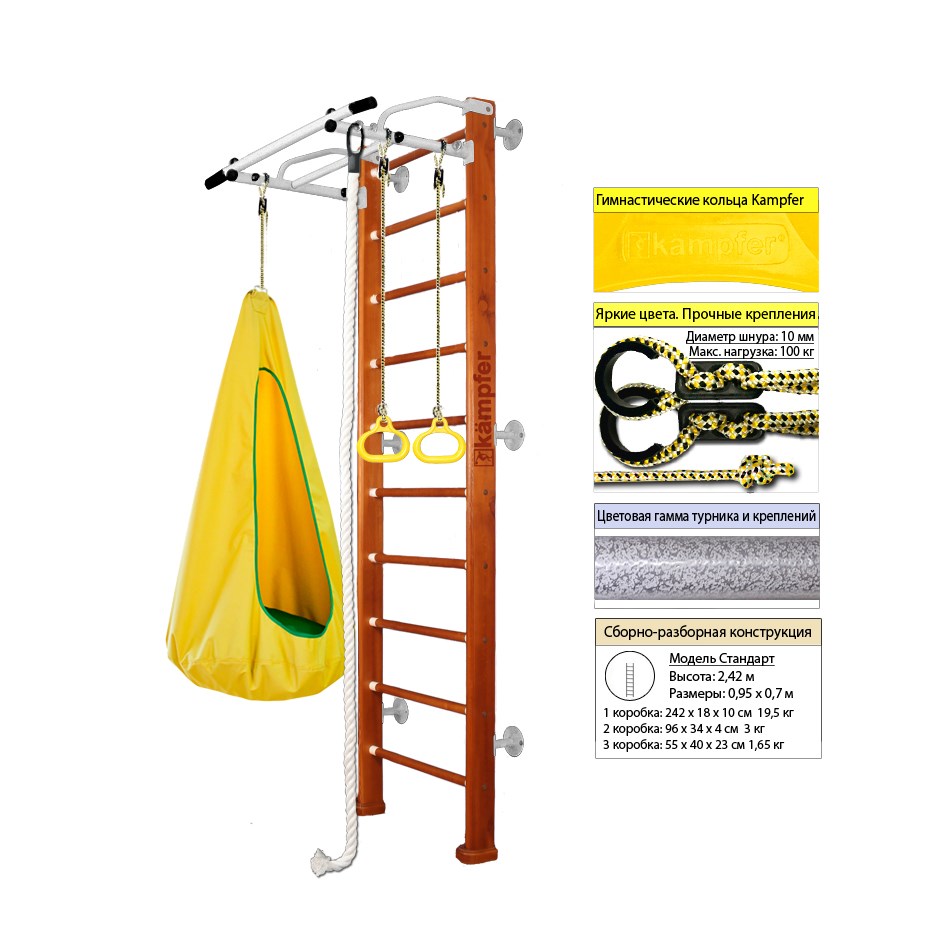 В комплекте с шведской стенкой идут канат, турник, гимнастические кольца и качели-кокон. Максимальная нагрузка на навесное оборудование составляет 60 кг.