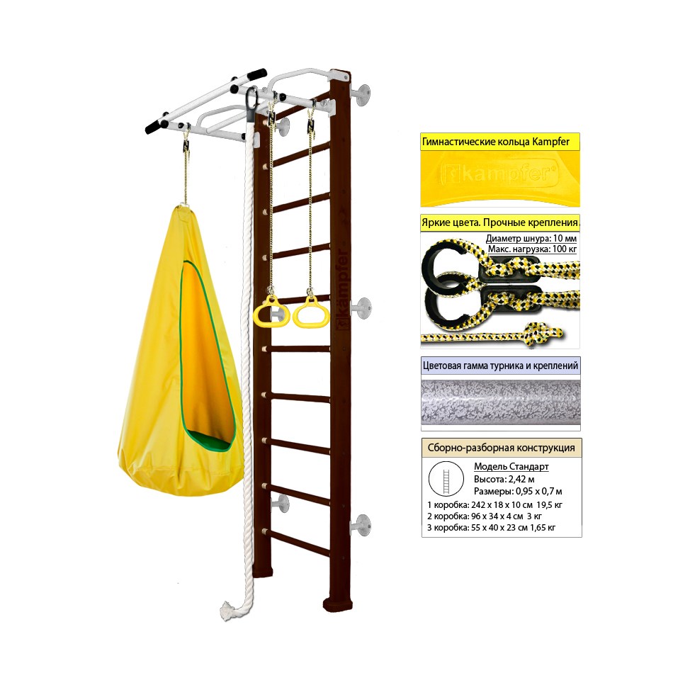 В комплекте с шведской стенкой идут канат, турник, гимнастические кольца и качели-кокон. Максимальная нагрузка на навесное оборудование составляет 60 кг.