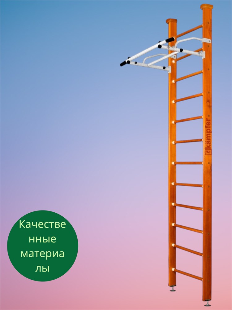 Шведская стенка Kemfer Swedish Ceiling выполнена из дерева, что гарантирует прочность и долговечность конструкции. Турник изготовлен из металла, что обеспечивает его надежность и устойчивость к нагрузкам.