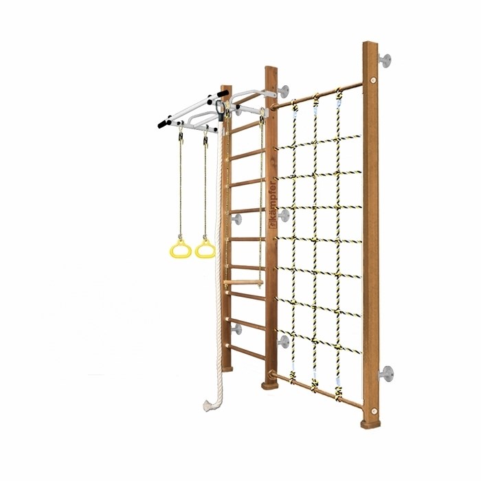 В комплектацию Kemfer Winner Wall входят турник, канат, кольца, трапеция и стойка с сеткой. Турник выдерживает нагрузку до 120 кг, а навесное оборудование - до 100 кг. Стойка с сеткой шириной 94 см расширяет игровое пространство и позволяет разнообразить функциональность шведской стенки.