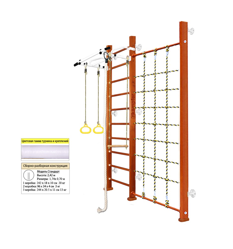 В комплектацию Kemfer Winner Wall входят турник, канат, кольца, трапеция и стойка с сеткой. Турник выдерживает нагрузку до 120 кг, а навесное оборудование - до 100 кг. Стойка с сеткой расширяет игровое пространство и позволяет разнообразить функциональность шведской стенки.