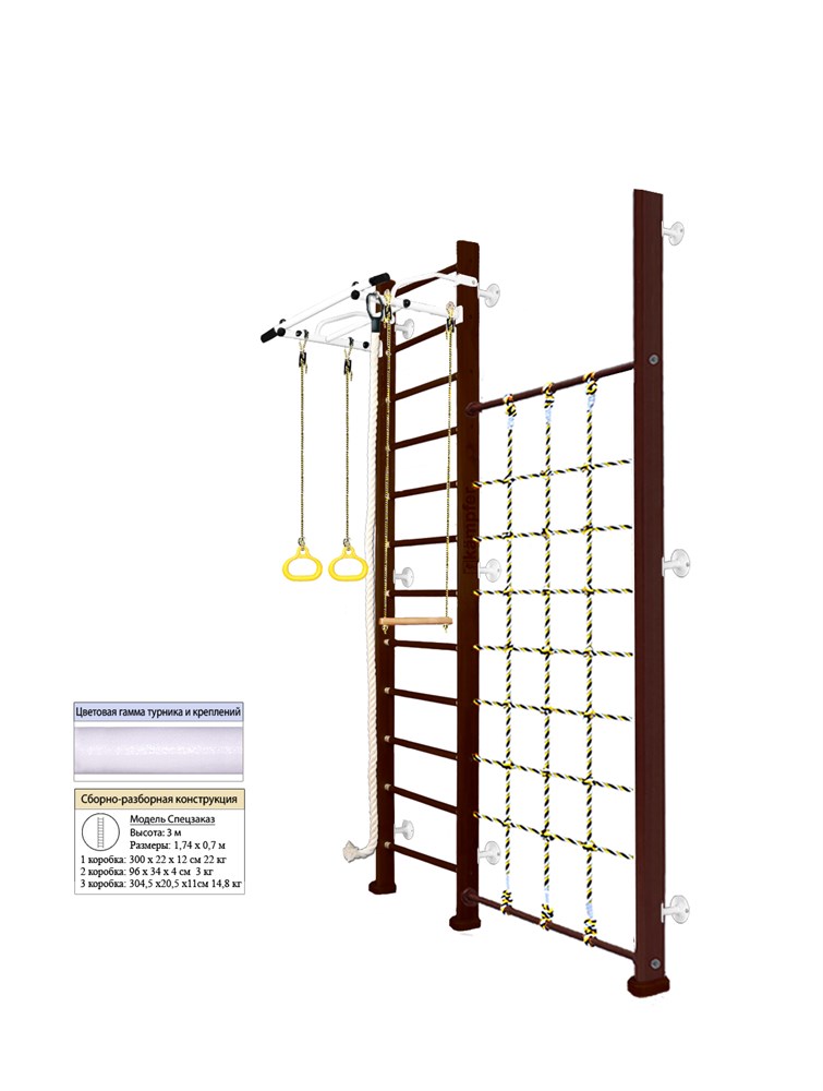 Конструкция шведской стенки Kemfer Winner Wall обеспечивает максимальную устойчивость и безопасность. Высота комплекса составляет 3 метра, что позволяет использовать его даже в помещениях с высокими потолками. Общая ширина шведской стенки и стойки с сеткой составляет 174 см, а ширина захвата турника - 95 см.