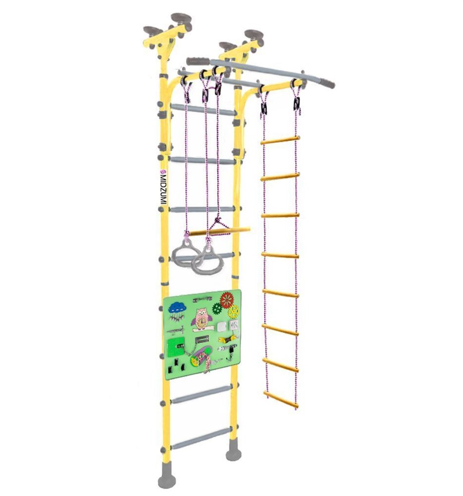Детский комплекс для занятий спортом с домашних условиях Midzumi Banji Busyboard поможет ребенку подружиться со спортом, а также ускорит приобретение малышом необходимых в жизни навыков. Это не просто спортивный уголок, а возможность позаниматься на гимнастических кольцах, освоить веревочную лестницу или покататься на тарзанке – 3 развлечения в одном месте, и все это займет совсем немного места.