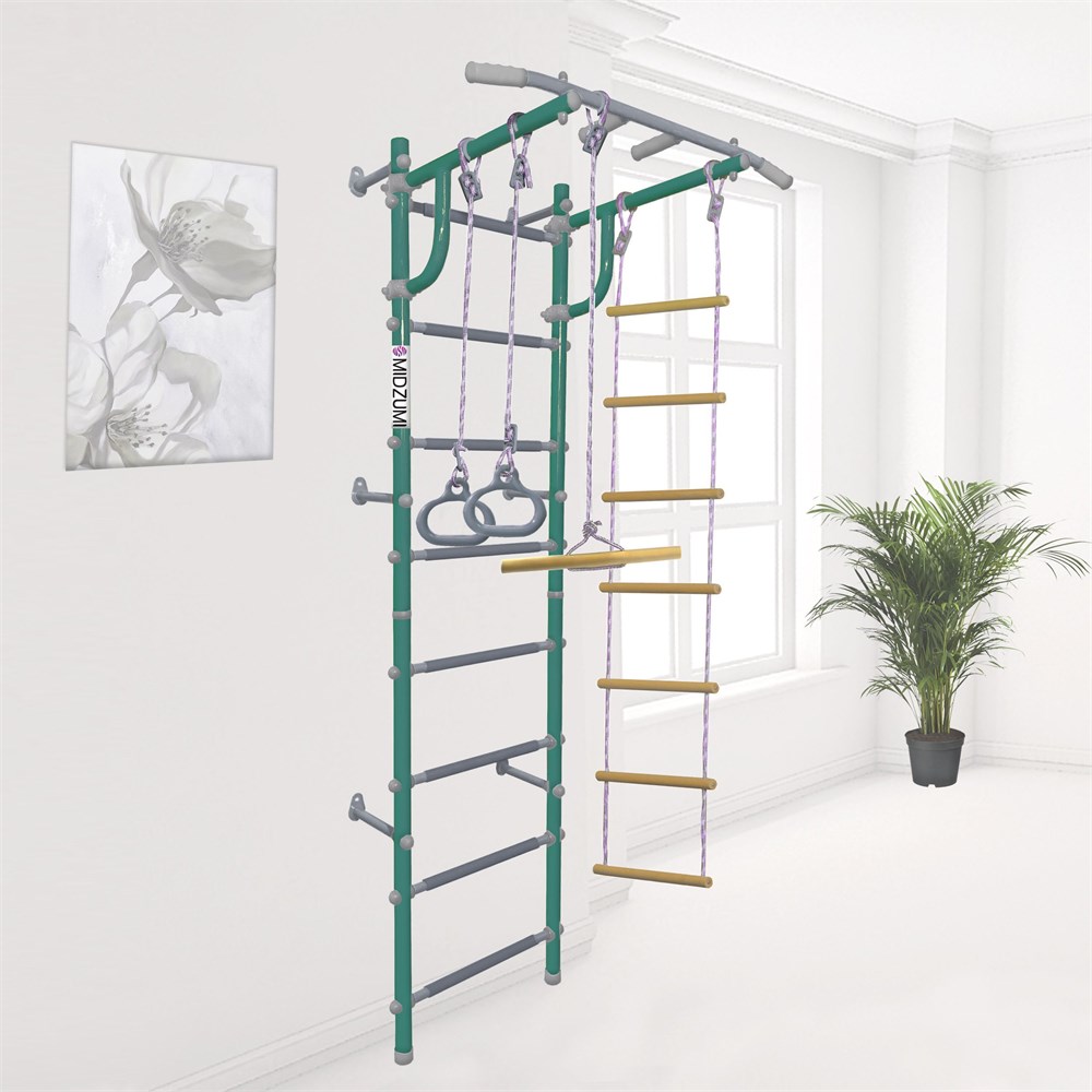 Домашний спортивный комплекс Midzumi Banji Kabe подарит ребенку возможность полюбить спорт, расти здоровыми и уверенными в себе личностями. Организуйте спортивный уголок с помощью универсальной и малогабаритной шведской стенки, которая оснащена веревочной лестницей, тарзанкой и гимнастическими кольцами.