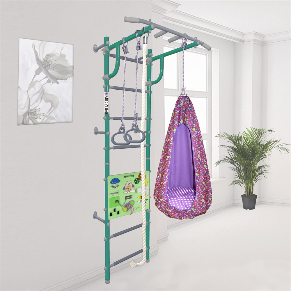 Комплектация: основа - металлическая шведская стенка с турником, гимнастические кольца, канат, качели-кокон, бизиборд.