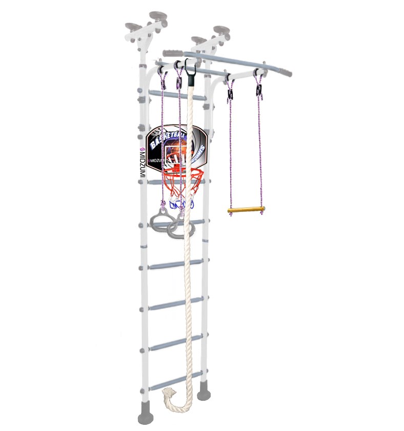 — Комплектация: трапеция, канат и гимнастические кольца, баскетбольный щит с мячом