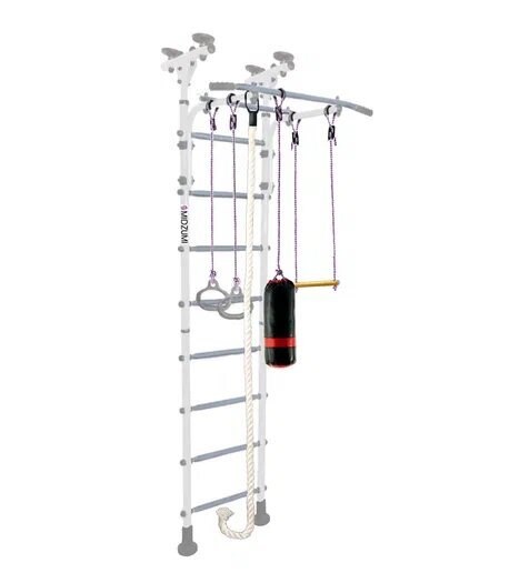 В комплект поставки входит шведская стенка, боксерский мешок, гимнастические кольца, трапеция, канат, а также боксерский мешок.