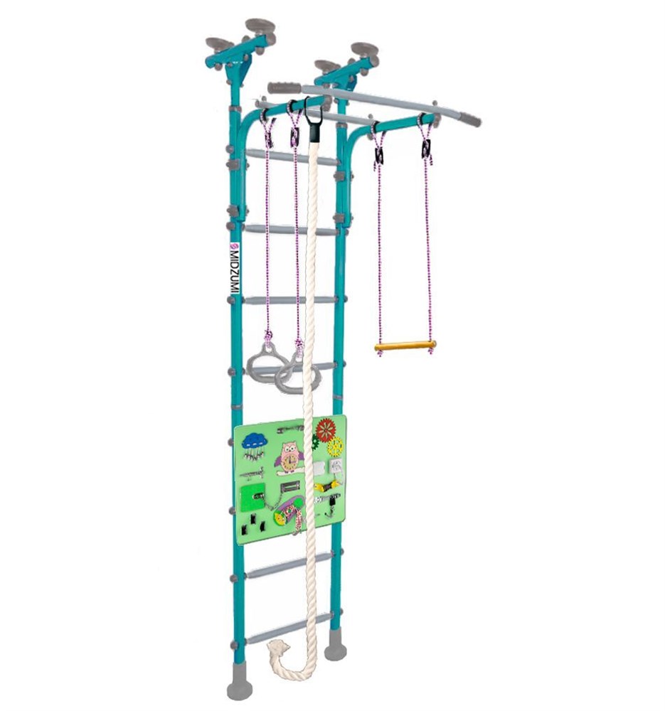 Ребенок не видит жизни без приключений и активен даже дома? Решение есть: спортивный уголок, который станет не просто занятием «на пять минут», а предметом исследования, привив ребенку любовь к занятиям спортом. Отличным решением станет шведская стенка Midzumi Hoshi Busyboard, подходящая как для совсем маленьких непосед, так и для детей постарше: первых заинтересует яркая доска с интересными штуками, вторых – комплект из турника, гимнастических колец, каната и трапеции. Интересно будет всем: если у вас несколько детей, то очередь к спортинвентарю гарантирована.Впрочем, если старший ребенок занят уроками, младшего можно занять бизибордом – умной доской Midzumi Busyboard Sovushka, на которой расположены различные по цвету и текстуре элементы (и сделано это по рекомендации опытных педагогов!), выполняющие функцию обучения. Малыш сможет освоить счет, цвета, названия предметов, научиться завязывать шнурки и даже пользоваться розеткой без опасности получить электрический разряд. Сенсорика, моторика, внимание и прочие необходимые в жизни навыки развиваются гораздо активнее, а скилл владения бытовыми предметами прокачивается на 800% быстрее.— Крепление враспор между полом и потолком удобно тем, что подходит для любых стен, и комплекс можно передвигать с места на место.Но потолок не должен быть из хрупких материалов, таких как гипсокартон (навесные) и вагонка, для них лучше подойдут пристенные модели.Комплектация: основа - металлическая шведская стенка с турником, гимнастические кольца, канат, трапеция, бизибордХарактеристики:— Крепление: враспор— Конструкция: сборная-разборная, передвижная— Обрезиненные перекладины— Возможные цвета: лимонный пай, ментоловый сорбет, небесная лазурь, снежный барс—Высота регулируется во время установки— Габаритные размеры: 0,9 х 0,8 х 2,4 - 2,9 м— Размер выноса турника (от стойки): 60 см— Ширина лестницы от края до края стоек без учета выступающих креплений: 55 см— Ширина лестницы от края до края стоек с учетом выступающих креплений: 59 см— Ширина лестницы внутри от края до края стоек: 46 см— Расстояние между ступенями лестницы от края одной до края другой ступеньки: 24,5 см— Длина захвата турника: 90 см— Максимальная нагрузка на комплекс: до 100 кг.— Цветовая гамма основания бизиборда: Голубой, Розовый, Салатовый— Материал основания: дерево (фанера)— Материал элементов бизиборда: дерево, пластик, металл, ткань— Размеры бизиборда (ДхШхВ): 50 х 45 х 5 см— Вес бизиборда (нетто): 2,2 кгРазмеры в упаковке: (ДхШхВ):1 место (шведская стенка): 122 х 44 х 14 см 27,95 кг2 место (бизиборд): 51,5 х 47,5 х 5,5 см 2,5 кгОбщий вес упаковки: 30,45 кг— Гарантийный срок: 1 год