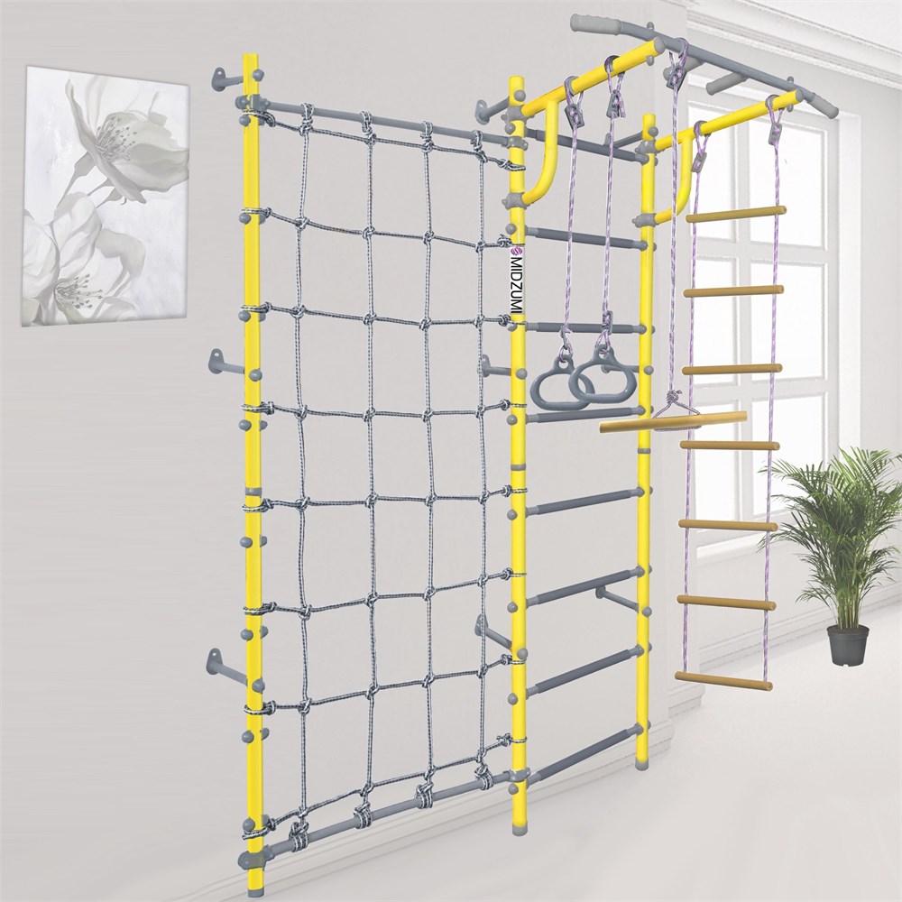В комплект шведской стенки входят гимнастические кольца, тарзанка, веревочная лестница и канатный лаз. Это позволяет разнообразить занятия и сделать их более интересными и разнообразными.