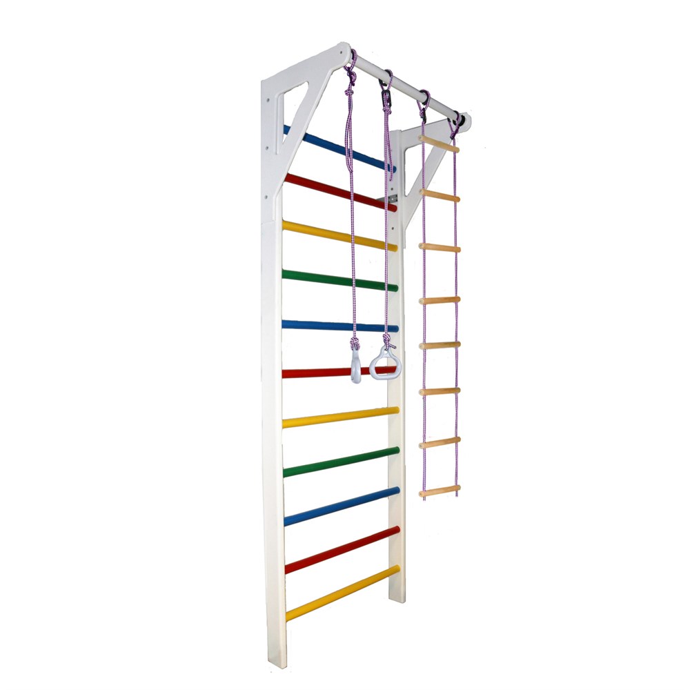 В комплектацию входят гимнастические кольца и веревочная лестница, которые добавят разнообразия в занятия на шведской стенке.