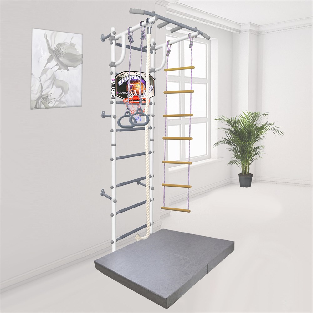 Комплектация: основа - металлическая шведская стенка с турником, гимнастические кольца, канат, веревочная лестница, баскетбольный щит с мячом и насосом, мат гимнастический складной