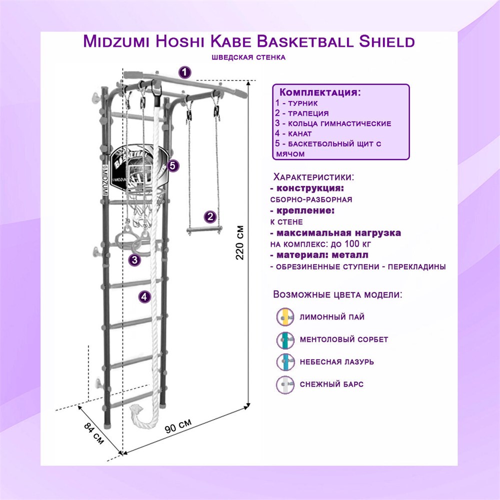 Шведская стенка Midzumi Ringu "Снежный барс" доступна в четырех цветах: лимонный пай, ментоловый сорбет, небесная лазурь и снежный барс. Габаритные размеры составляют 0,9 х 0,8 х 2,4 - 2,9 м, а размеры упаковки - 122 х 44 х 14 см. Вес брутто составляет 26,75 кг.