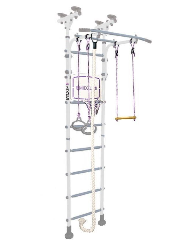 Модель состоит из металлической шведской стенки с турником, гимнастических колец, каната и трапеции. Баскетбольное кольцо Midzumi малое входит в комплект.