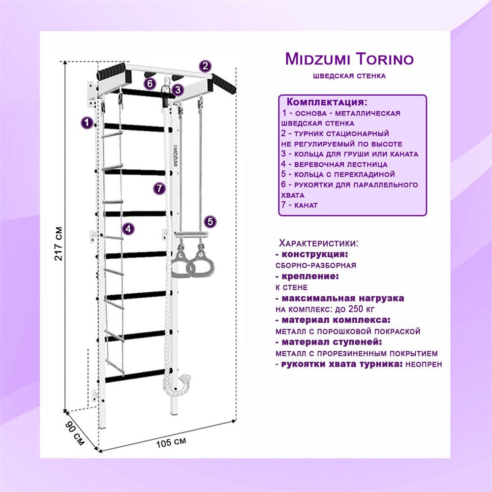 Шведская стенка Midzumi Torino - это спортивный комплекс для всей семьи, который станет незаменимым элементом интерьера благодаря своему нейтральному белому цвету. Турник с усиленной прочностью и дополнительными креплениями для аксессуаров и снарядов (боксерская груша, TRX и пр.) обеспечивает безопасность и комфорт во время занятий.