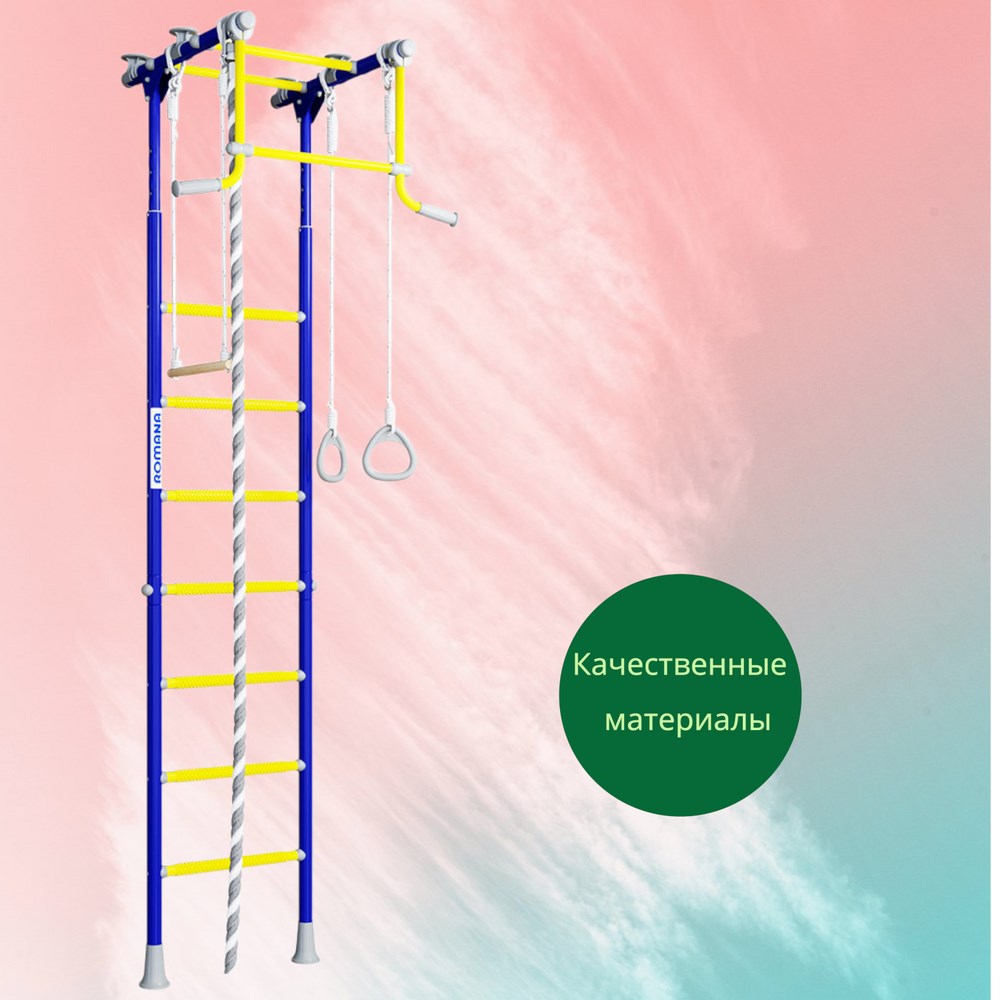 Материал стоек и перекладин - металл, что гарантирует прочность и долговечность конструкции. Допустимая нагрузка на комплекс составляет 100 кг, что позволяет использовать его для детей и взрослых.