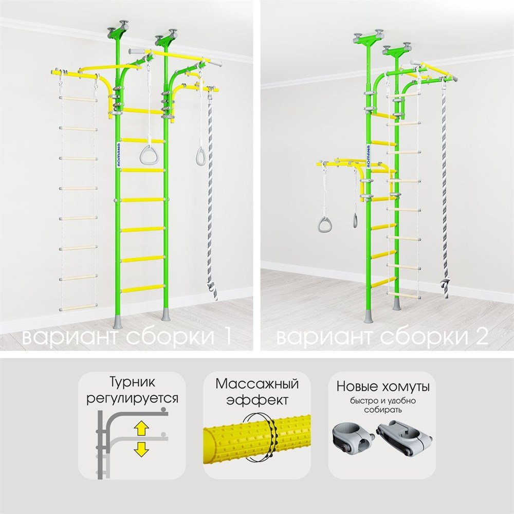 Шведская стенка ROMANA R6 имеет два варианта сборки, что позволяет выбрать наиболее подходящий для вашего помещения. Также есть возможность установки турника на разной высоте, что обеспечивает гибкость использования.