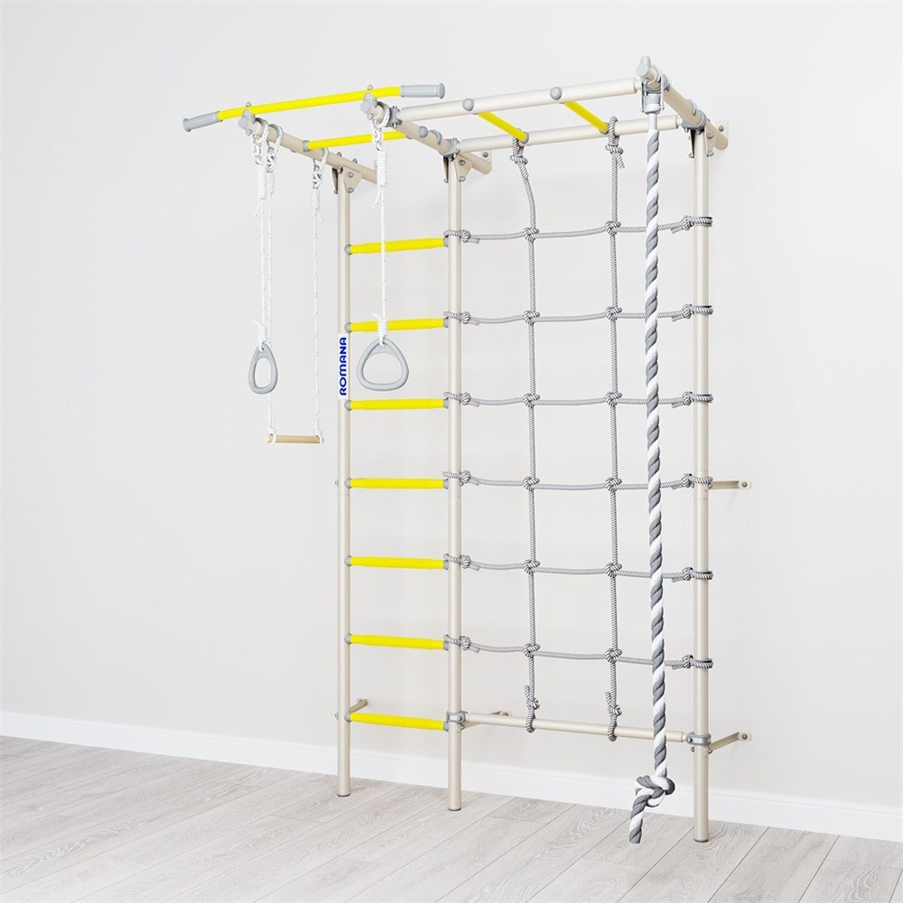 Комплектация комплекса включает в себя шведскую стенку, канат, гимнастические кольца, трапецию и сетку для лазанья. Сетка для лазанья имеет возможность установки как слева, так и справа от шведской стенки.