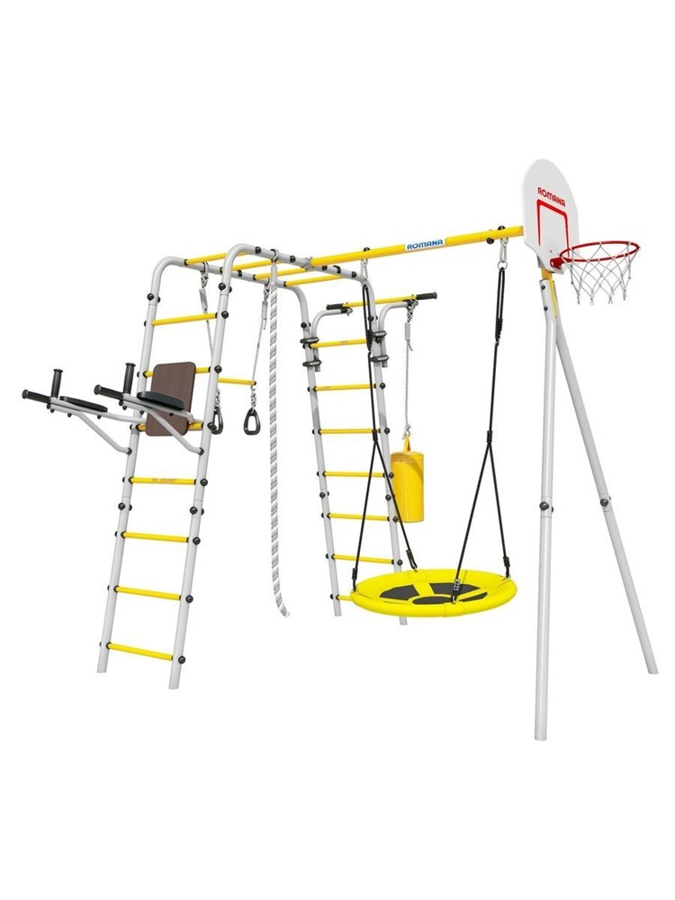 Уличный спортивный комплекс ROMANA Fitness Фитнесс 103.20.05-01 серый/желтый с качелями гнездо – это детский спортивно-игровой комплекс, который идеально подойдет для установки на дачном участке, в загородном доме и на частной детской площадке. Модель Фитнесс дает ребенку начальную физическую подготовку, помогает развить ловкость и гибкость. В комплекте: турник подвижный, щит баскетбольный, канат, кольца гимнастические с перекладиной, брусья со спинкой, боксерский мешок, качели гнездо.