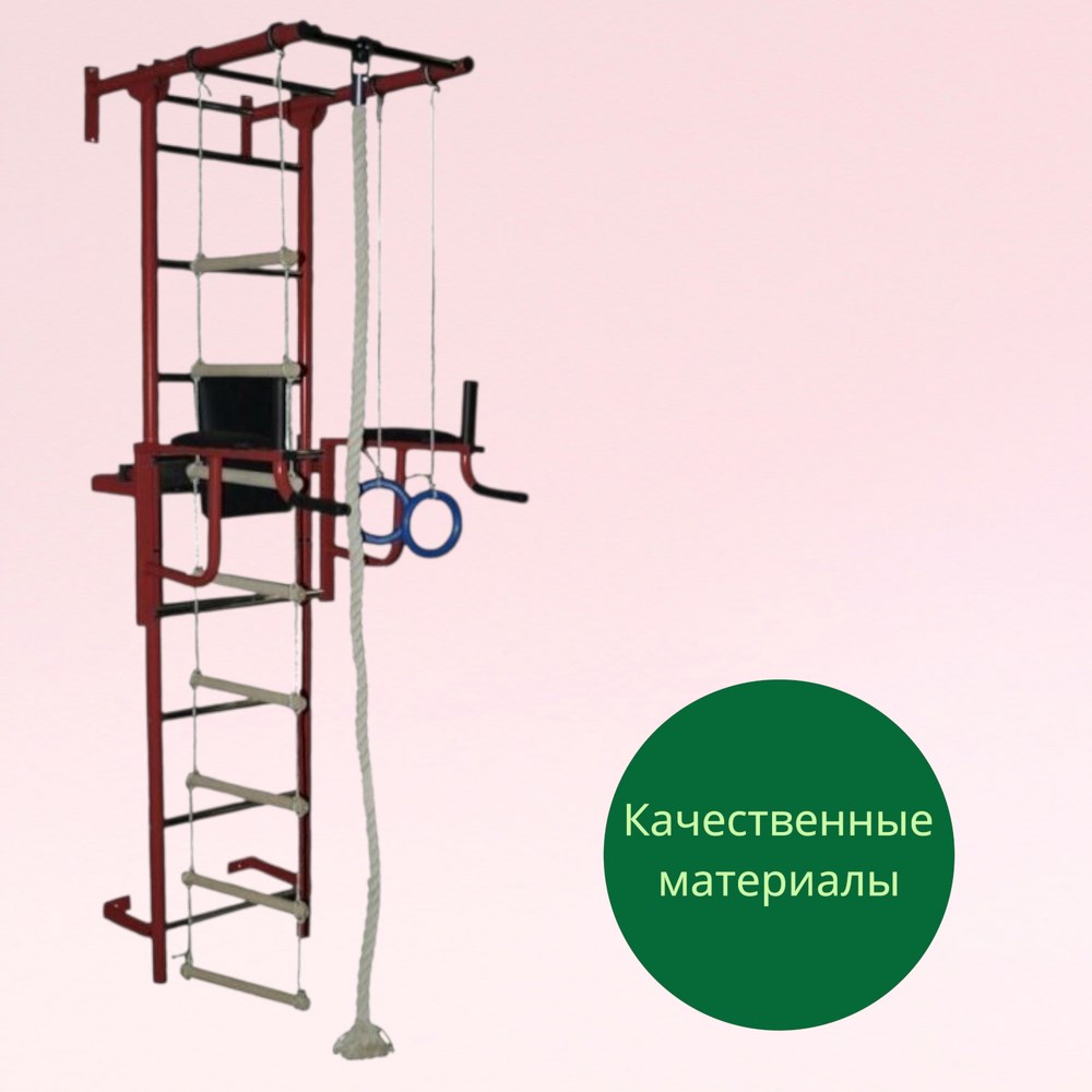 Подробная комплектация включает основание – металлическую шведскую стенку, турник-рукоход стационарный, брусья со спинкой, веревочную лестницу, кольца гимнастические и канат. Вес с упаковкой составляет 36 кг.