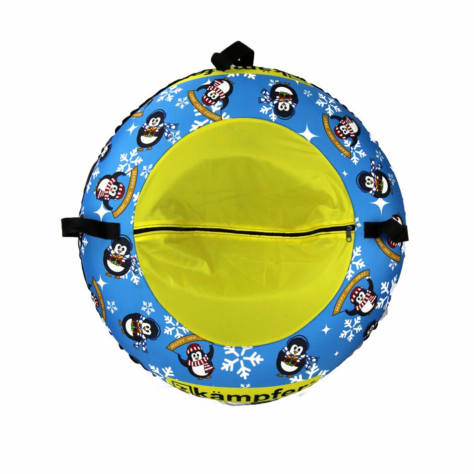 Тюбинг выполнен в ярком голубом цвете с веселыми пингвинами и снежинками, что обязательно привлечет внимание детей. Верх тюбинга изготовлен из морозоустойчивой ткани, которая обеспечивает комфорт при использовании. Дно тюбинга изготовлено из высокопрочного ПВХ плотностью 650 гр./м.кв., что обеспечивает хорошее скольжение и долгий срок службы.
