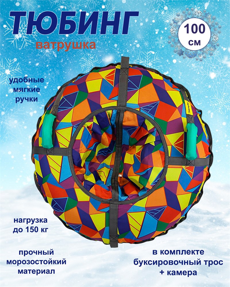 Тюбинг оборудован двумя удобными тканевыми ручками для комфортного управления. Стропы для прочности прошиты двойной строчкой, что гарантирует надежность и долговечность конструкции.